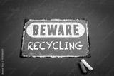 Recycling. Beware sign with text and colored pieces of chalk on a dark chalkboard background