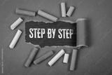 Step by step. Text under torn purple paper on a blackboard