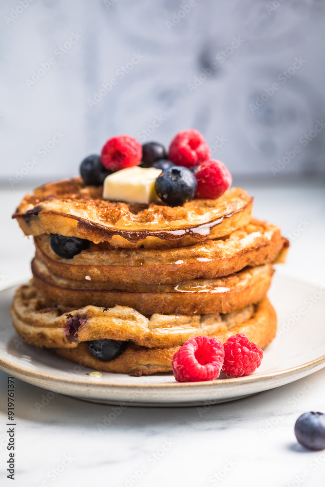 Stack of Belgium waffle pancakes topped with roses jam butter. Breakfast