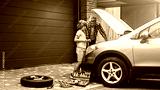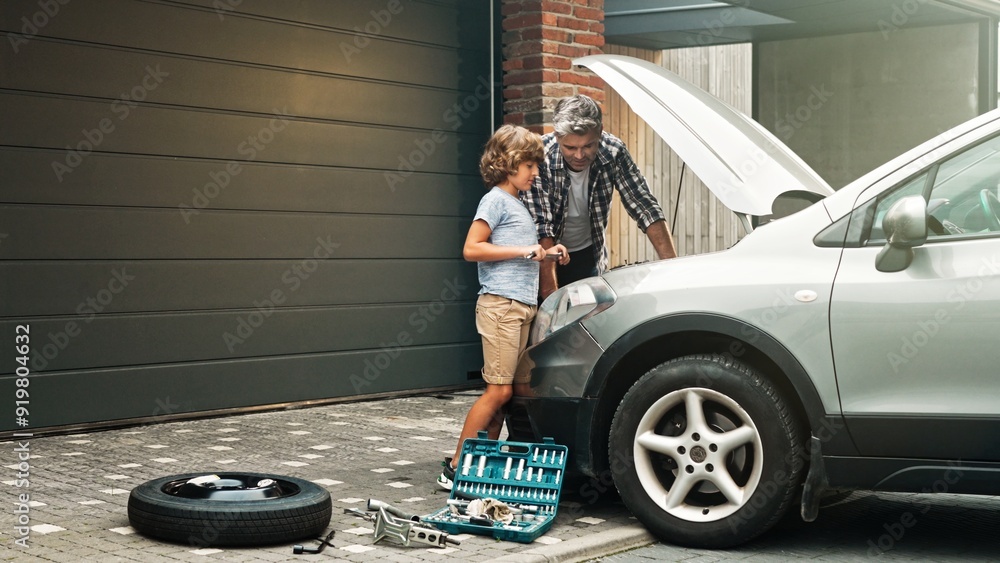 Son and dad are standing and fixing auto engine demages in the yard. Father teaches boy and showing him mechanical tools for repairing vehicles. Consept of successful fatherhood.