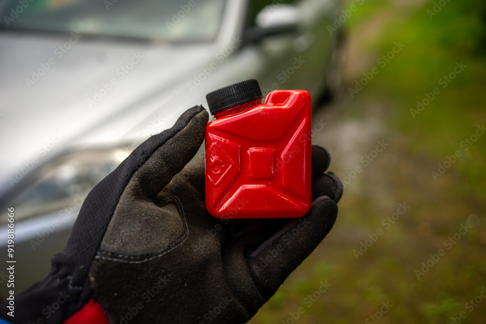 I ran out of gas.The hand holds a fuel canister.Refueling the car.
