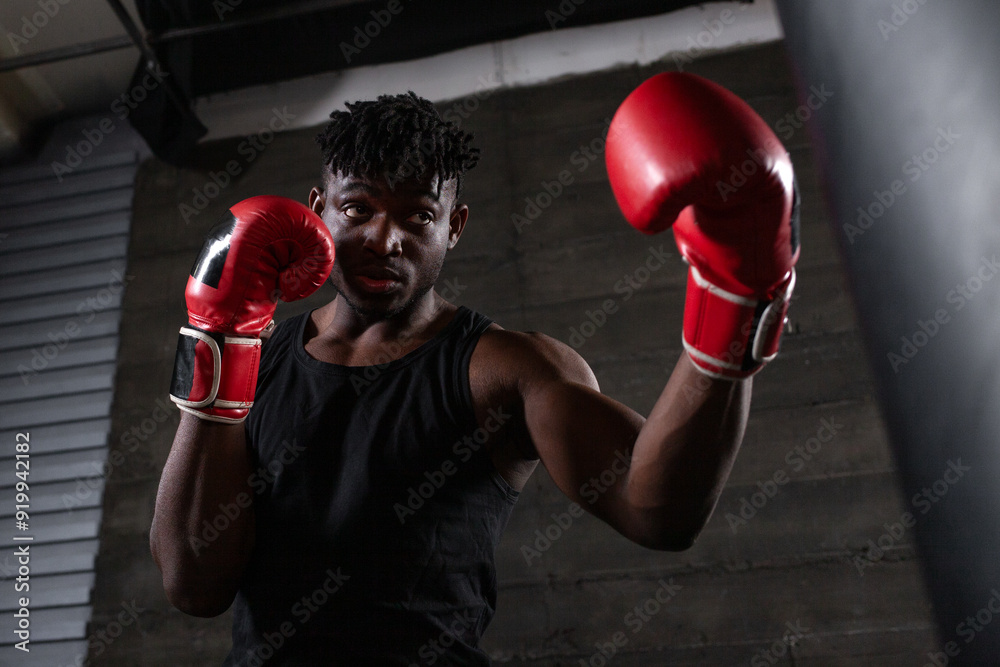Powerful African American boxer wearing red gloves prepares to hit punching bag in gym showing his determination and strength, athlete trains before boxing competition