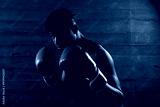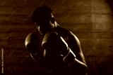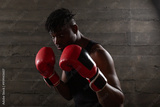 A powerful African American boxer in red gloves prepares for a punch in a gym, demonstrating determination and strength.