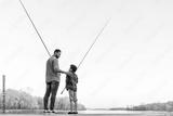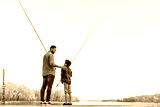 An African American father and son stand on a wooden pier fishing. The father, dressed in a jean shirt and jeans, puts his hand on the shoulder of his son, who is wearing a red plaid shirt and shorts