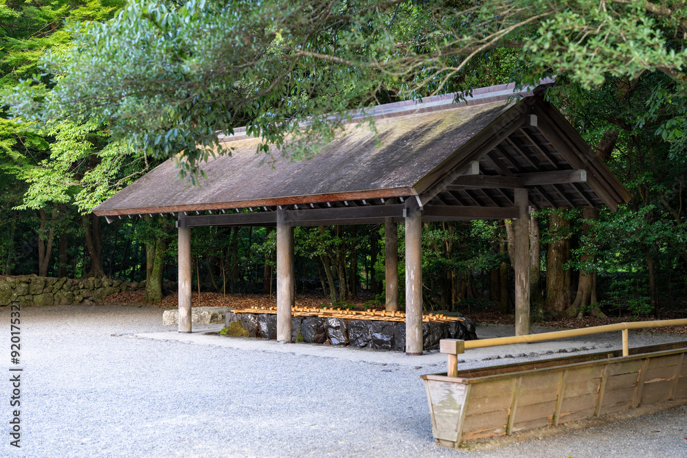Facade of Shinto water ablution pavilion (Chozuya) at Ise Jingu Shrine.