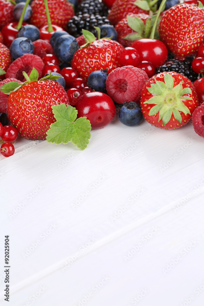 Beeren Früchte auf Holzbrett mit Erdbeeren, Himbeeren, Kirschen