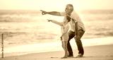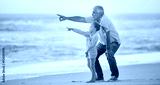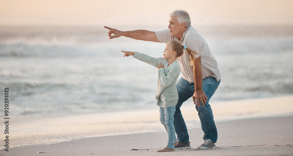 Grandfather, girl and pointing at beach for travel, bonding and sunset while on vacation together. Family, generations and fun outdoor by sea for dusk, relationship and adventure on tropical holiday
