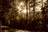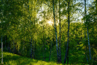 Grove of birches with young green leaves at sunset or sunrise in spring or summer.