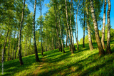 Grove of birches with young green leaves at sunset or sunrise in spring or summer.