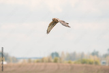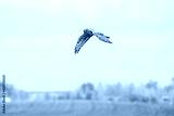 Harrier Or Circus Cyaneus Wild Bird Flies In Blue Sky. Young Ring-tail Harrier Flies Above Field. Adult Male Is Sometimes Nicknamed Grey Ghost. Natural Sky Background