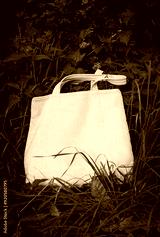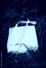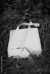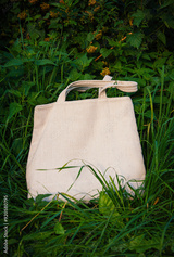 White canvas tote bag mockup template with long handles among the green plant leaves outdoor