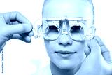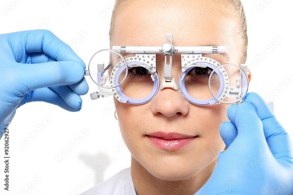 Dobór okularów, kobieta u okulisty. Pacjentka w gabinecie okulistycznym, dobór szkieł okularowych