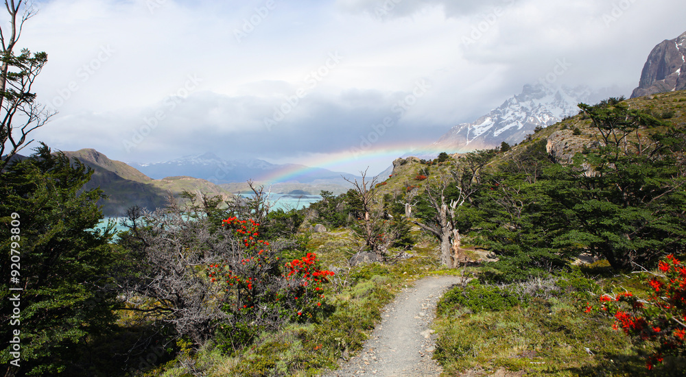 Rainbow going over Sarmiento lake and trees in front of Cerro Paine Grande