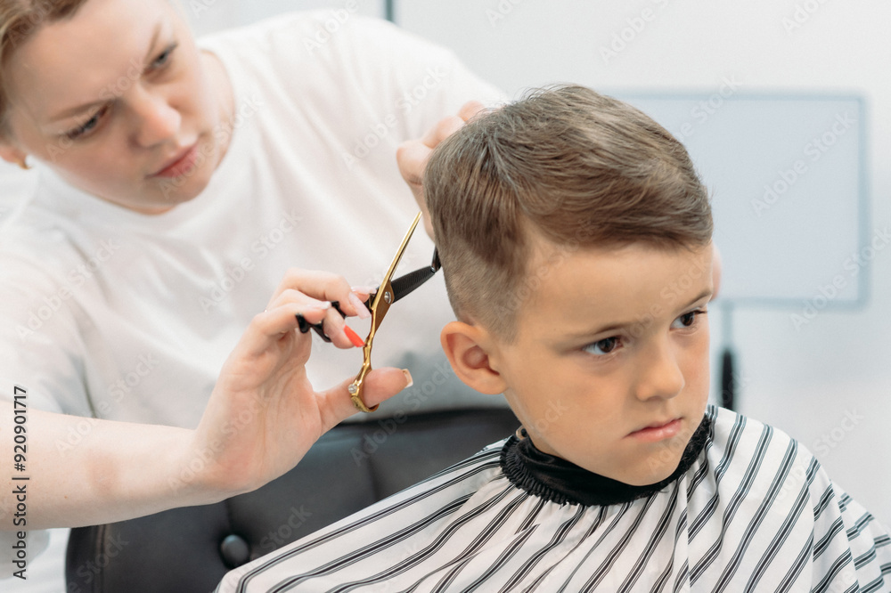 Professional hairdresser cutting boy's hair in beauty salon, close up