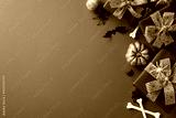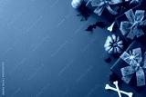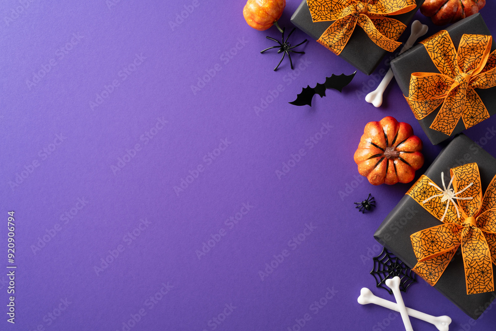 Halloween themed presents with orange ribbons and spooky decorations on a purple background symbolizing holiday celebration