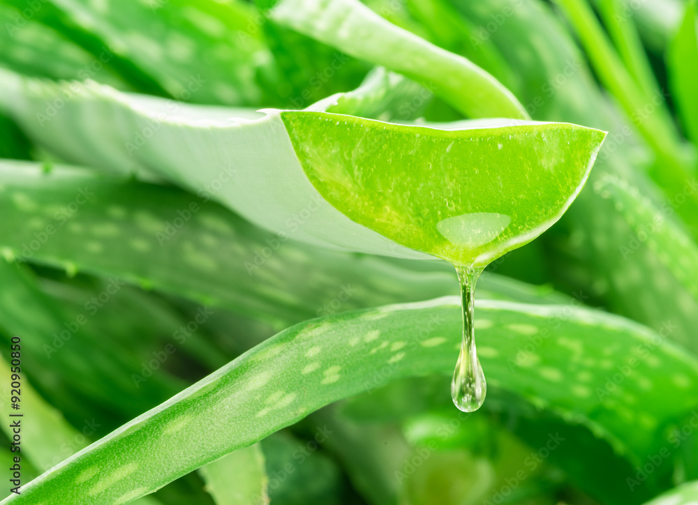 Aloe gel dropping from fresh aloe vera leaf cut. Aloe Vera plant at the background.
