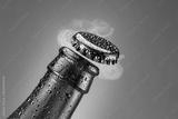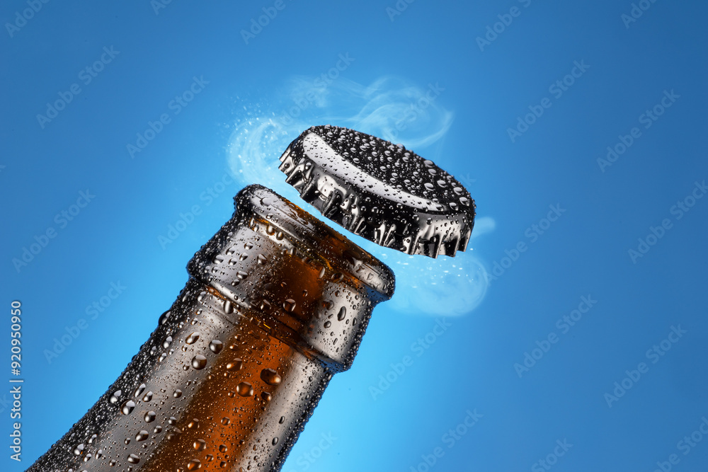 Opening beer bottle on blue background. Gas cloud going out of the beer bottle blowing the cap.