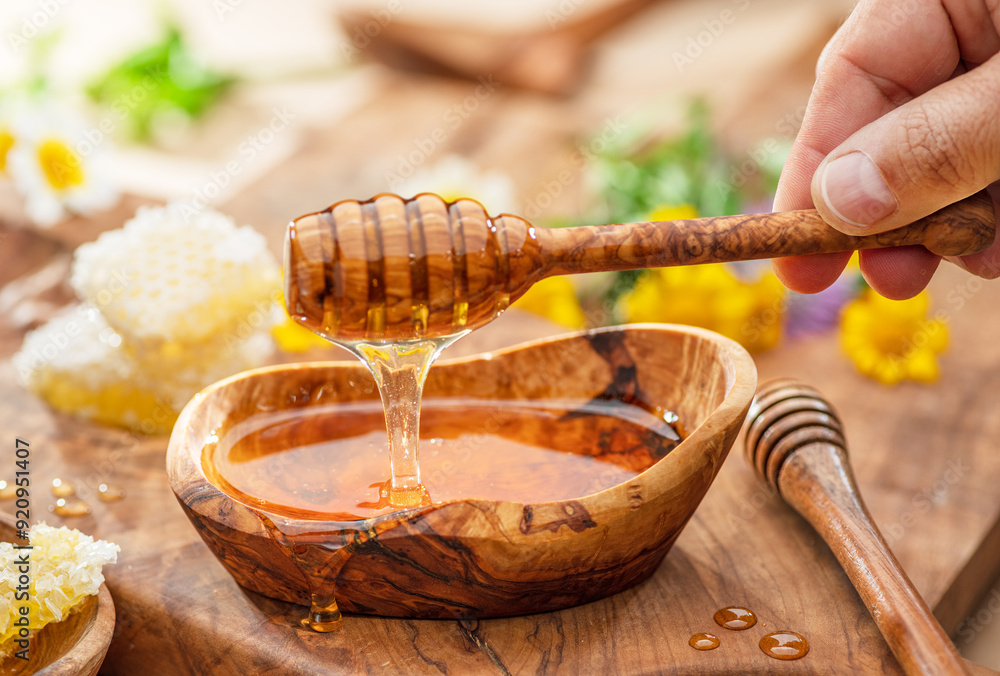 Honey dripping from wooden spoon into wooden bowl with honey, spring flowers are on wooden table near.