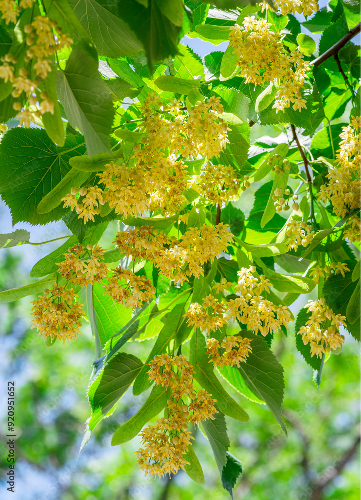 Linden flowers between abundant foliage leaves. Lime tree or tilia tree in blossom. Blue sky at the background.