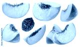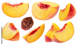 Set of ripe yellow juicy peach slices streaked with red isolated on white background. File contains clipping paths.