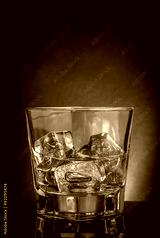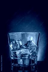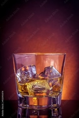 glass of whiskey on black table with reflection, violet light tint atmosphere