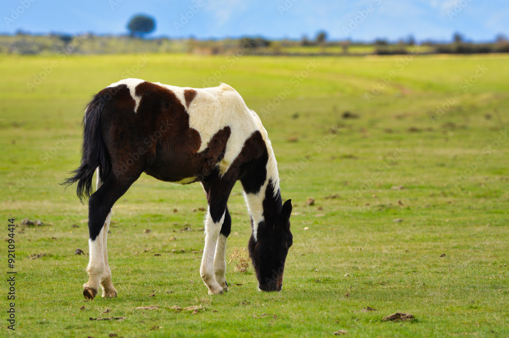 Caballo joven blanco y negro pastando en el campo, animal doméstico en libertad en un prado verde, escena de vida rural y naturaleza en la península ibérica