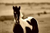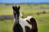 Caballo joven blanco y negro pastando en el campo, animal doméstico en libertad en un prado verde, escena de vida rural y naturaleza en la península ibérica