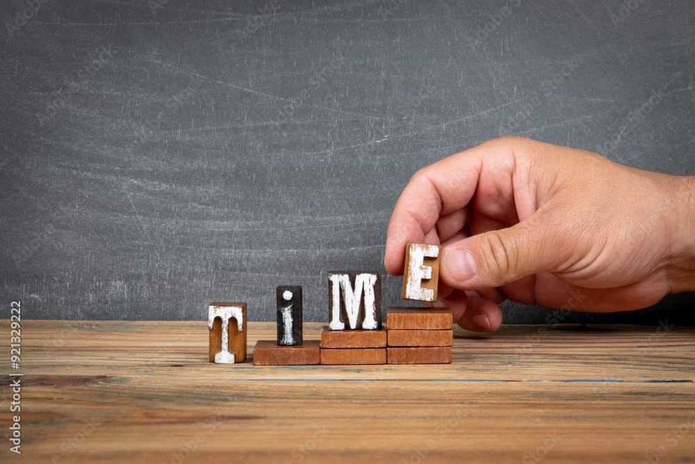 TIME. Wooden letters, alphabet blocks on steps. development and growth concept