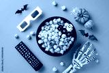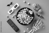 A fun Halloween movie night setup featuring popcorn, 3D glasses, skeleton hand, pumpkins, and Halloween decorations on an orange background