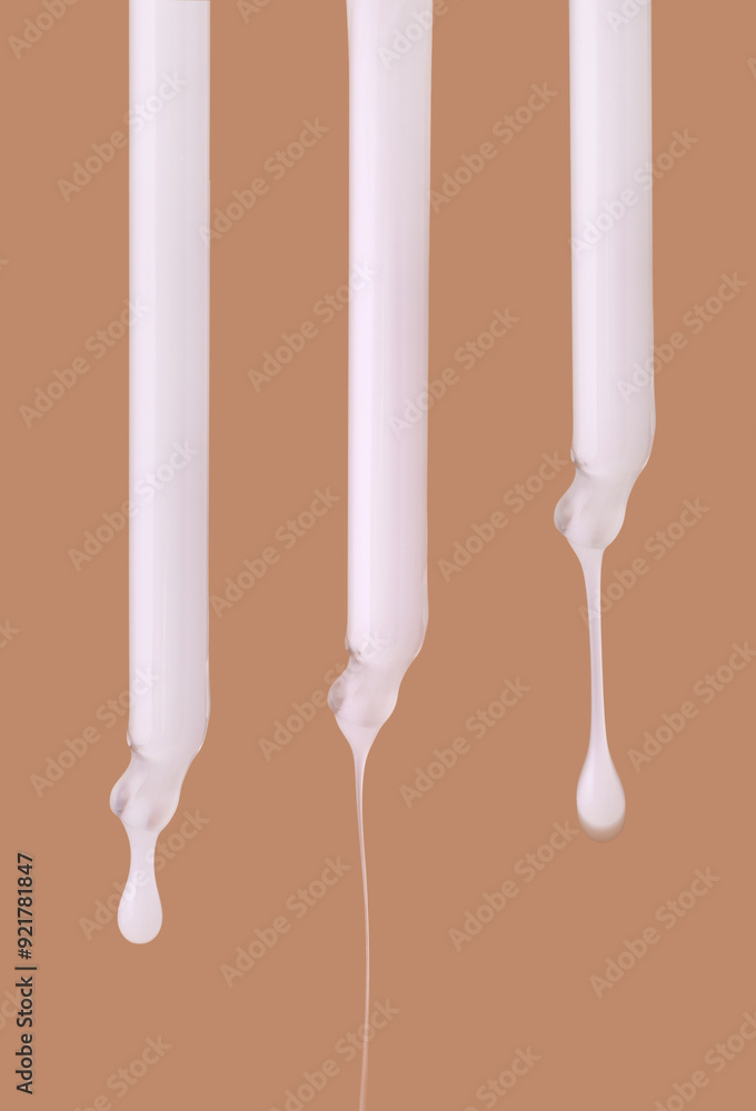 pipettes with white serum close-up falling drops on a beige background