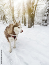 Siberian husky dog portrait in winter. Brown Siberian sled dog husky over snowy background.