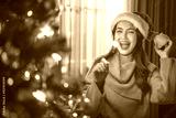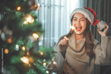 Happy asian woman celebrating Christmas and new year with sparkler fire. Concept of people and celebration