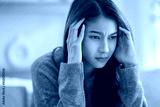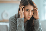 Depressed young woman sitting on couch in the living room at home, Frustrated confused female feels unhappy problem in personal life quarrel break up with boyfriend