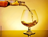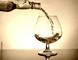 barman pouring snifter of brandy in elegant typical cognac glass on table