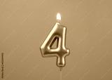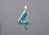 Burning blue birthday candle on gray background, number 4