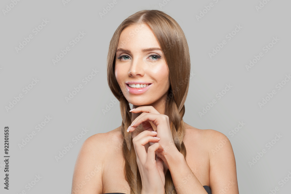 Cheerful young healthy woman with pigtail hairstyle and natural make-up on white background