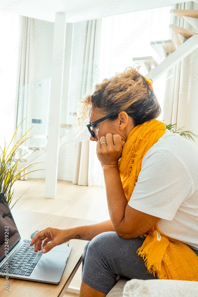 Modern woman working on a laptop at home, sitting comfortably on a couch and navigating the internet with a fast wireless connection, captured from a side view