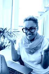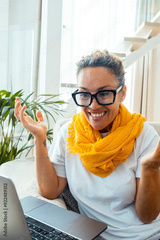 Front view of an adult woman working on a laptop with a surprised, happy, and excited expression during a video call. She is smiling at the screen while gesturing with a yellow scarf, reflecting