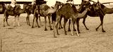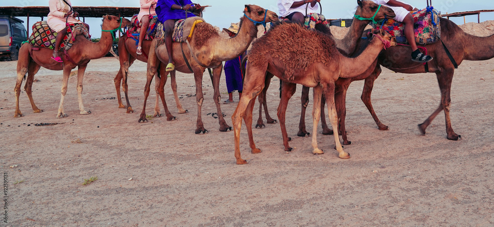 Camel train silhouetted against colorful sky crossing the Sahara Desert, Morocco