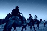 Camel train silhouetted against colorful sky crossing the Sahara Desert, Morocco