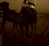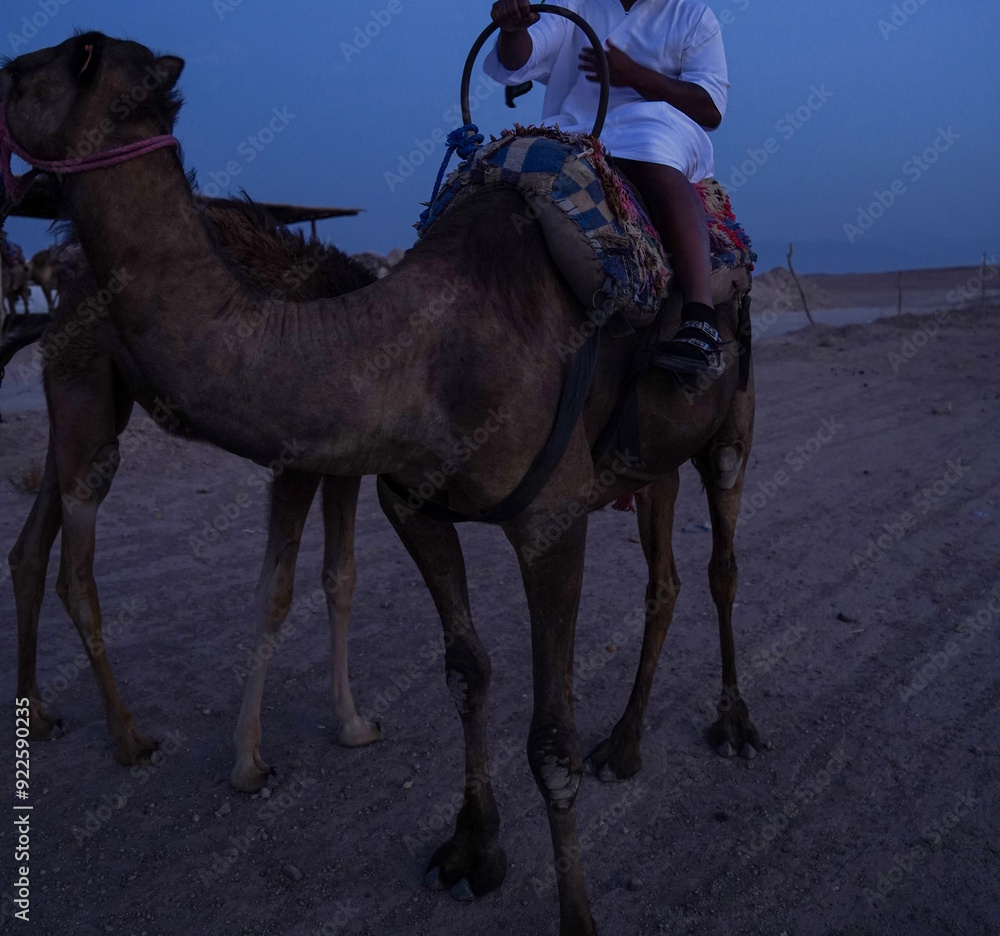 Camel train silhouetted against colorful sky crossing the Sahara Desert, Morocco