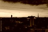 Sunrise View of Eiffel Tower and regency Tower against Golden Hour orange Sky in Paris morning