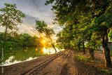 Tire marks on a dirt road in the countryside landscape lake views and the reservoir the forest summer with evening blue dramatic sunset sky nature background.