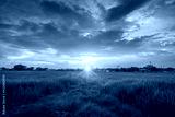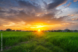 Scenic view landscape of Rice field green grass with field cornfield or in Asia country agriculture harvest with fluffy clouds blue sky sunset evening background.
