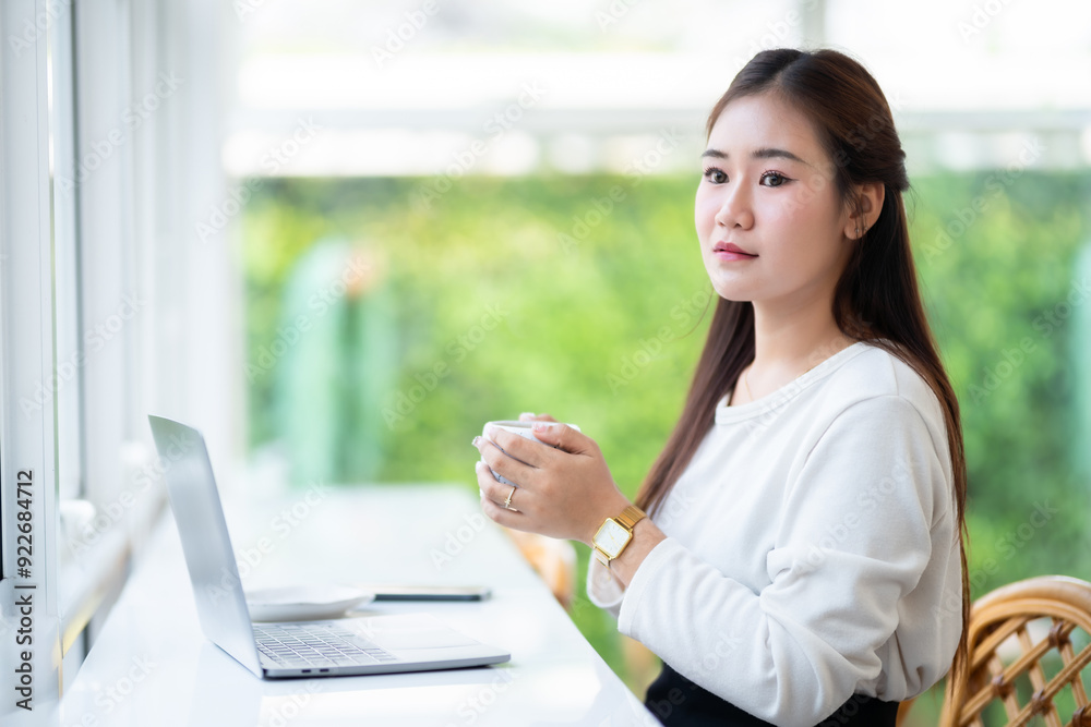 Portrait of beautiful happy Smiling of hands Holding cup mug of Hot coffee latte wits business female casual working with laptop computer in coffee shop like the background,communication concept