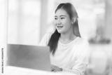 asian freelance people business female talking making using casual working with laptop computer for browsing internet, chatting and blogging and smartphone,notebook in coffee shop,Nature Outdoor