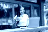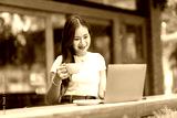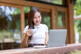 asian freelance people business female read writing message on smartphone using casual working with laptop computer for browsing internet, chatting and blogging and smartphone,notebook in coffee shop.