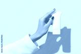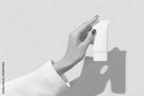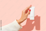 Womans hand holding white cosmetic tube on pink background. Cosmetics sale concept