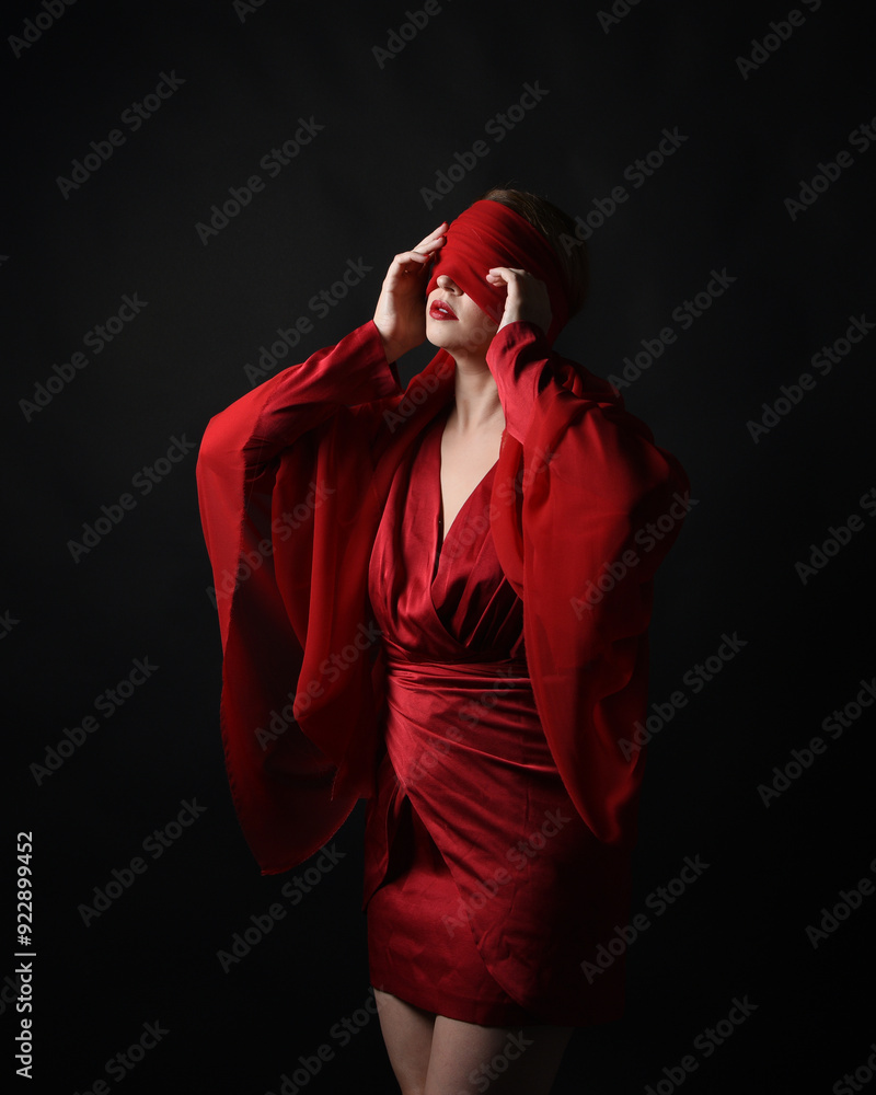 close up portrait a female model wearing a red silk dress and a fabric blindfold covering her eyes. isolated on a dark studio background with moody emotive arm gestures.
