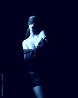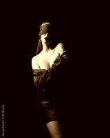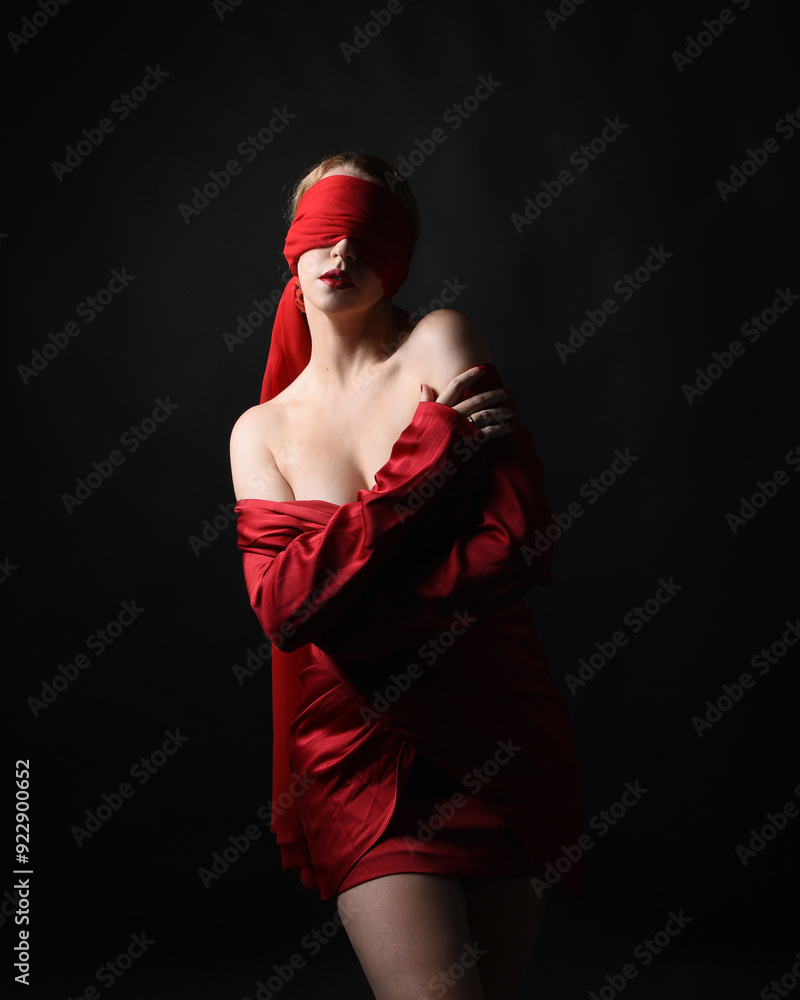 close up portrait a female model wearing a red silk dress and a fabric blindfold covering her eyes. isolated on a dark studio background with moody emotive arm gestures.
